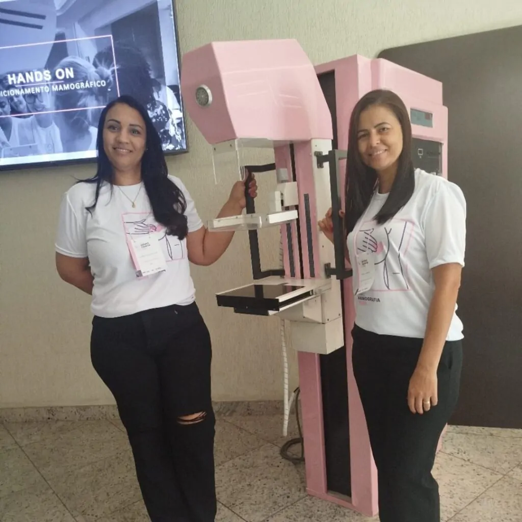 As colaboradoras do serviço de imagem do Hospital Nossa Senhora das Dores (HNSD), Hédina Lopes Soares e Patrícia Gomes Rosa, participaram do treinamento “Mamografia é Vida”, alinhado à Resolução SES/MG Nº 8.891. O programa visa garantir a aquisição de mamógrafos digitais e capacitar equipes para garantir exames de qualidade, contribuindo para a detecção precoce do câncer de mama. A capacitação ocorreu entre os dias 24 e 27 de setembro.