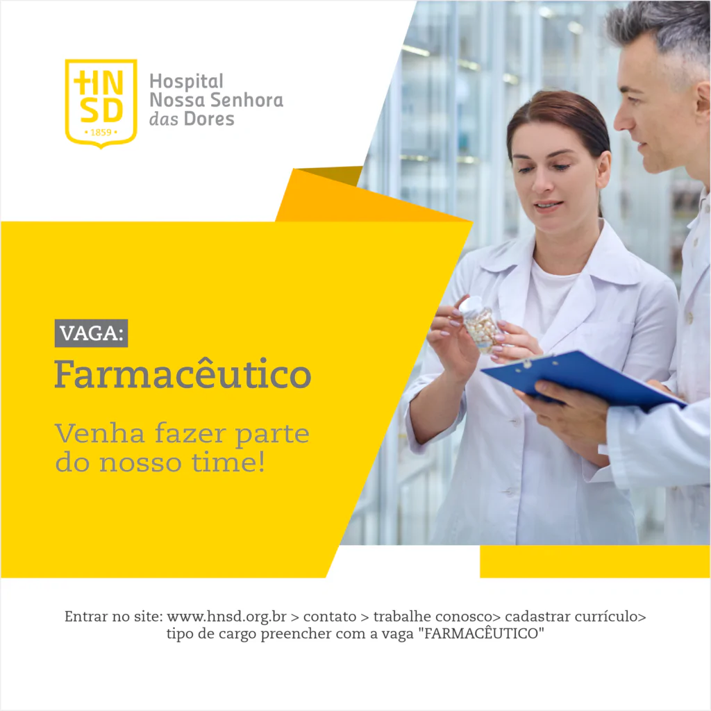 Entrar no site: www.hnsd.org.br > contato > trabalhe conosco> cadastrar currículo> tipo de cargo preencher com a vaga “FARMACEUTICO”